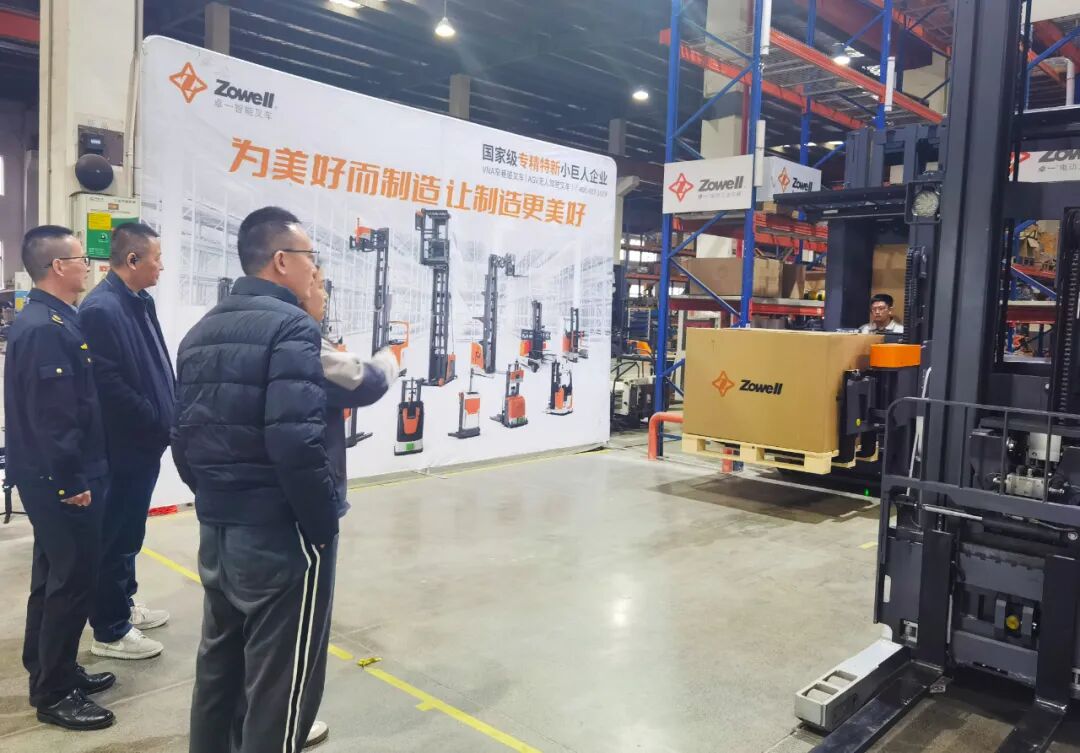 随后,由卓一市场部负责人的陪同,考察小组进入生产车间,参观了卓一窄巷道叉车及无人叉车产品展示区。工作人员从技术特点、应用场景、安全配置及维护保障服务等方面作了细致讲解和演示。