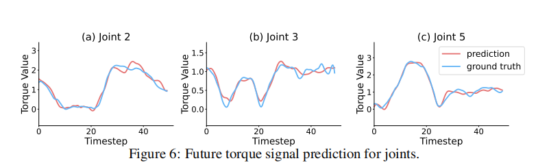 实验显示,模型能准确预测未来50步的扭矩变化(见下图),显著提升接触任务成功率。