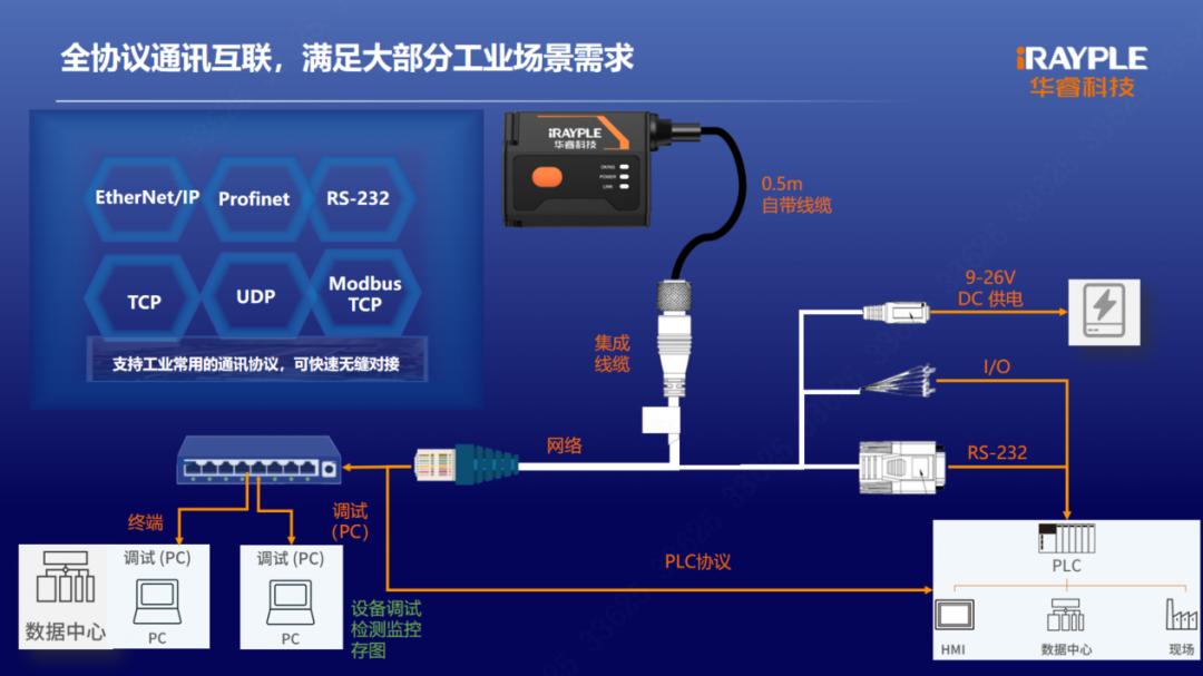 产品自带百兆网络,内置多路IO通讯,同时集成Profinet/EIP/Modbus等工业协议和TCP/ UDP/串口通用接口,可支持多种协议同时通信,满足PLC、机器人等多设备协同需求。