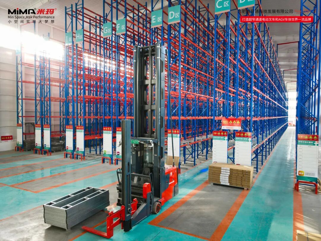 MiMA MCC16专为超窄通道设计,额定载重1.6吨,通道宽度仅需1.65米,标准起升高度可达14.2米,定制高度可达18.5米。该案例中MCC16的额定载重为1.1吨,根据客户需求定制加宽货叉架,起升高度定制至12米(对货叉宽度、起升高度如有更高需求可非标定制),充分利用仓库垂直空间,大幅提升仓储密度,有效降低客户的场地成本。其优化的车身结构与转向系统,能灵活应对复杂工况,完美适配密集存储需求 。