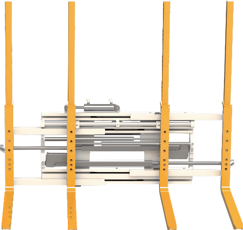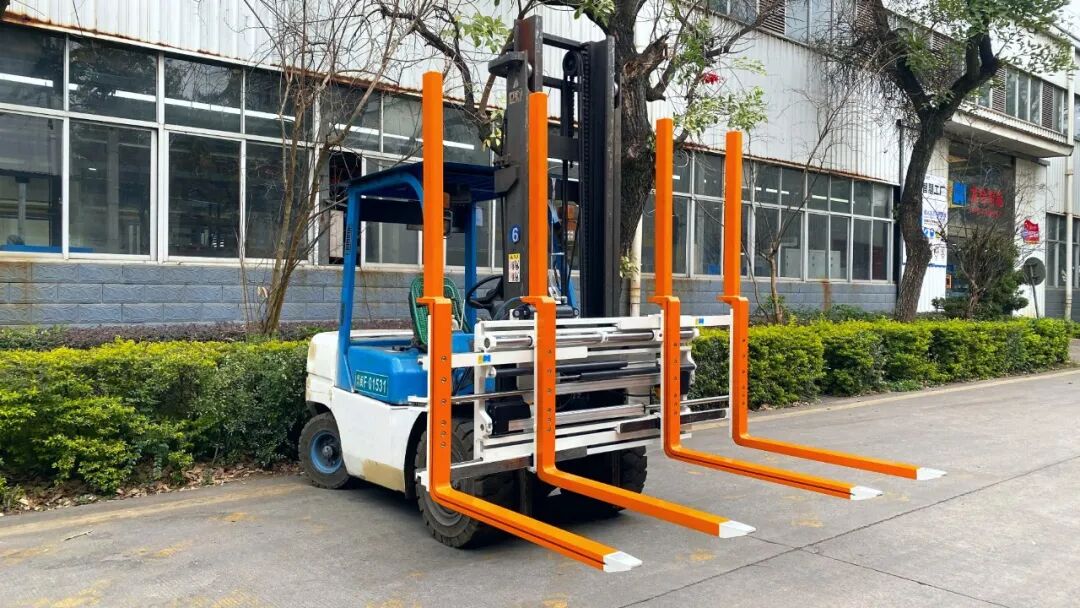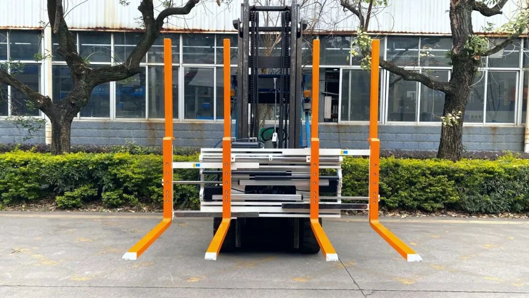龙合托盘叉自带±100mm侧移功能,就像给叉车装上“横向微调滑轨”,左右轻移即可对齐货位。更聪明的是它的双货叉设计: