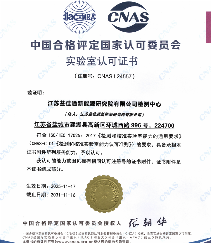 江苏益佳通新能源研究院有限公司检测中心(以下简称研究院检测中心),经过严苛的专家团评审过程,于2025年11月17日,成功获得CNAS认可。这标志着益佳通对动力电池的研究和测试更加具备规范性和权威性。