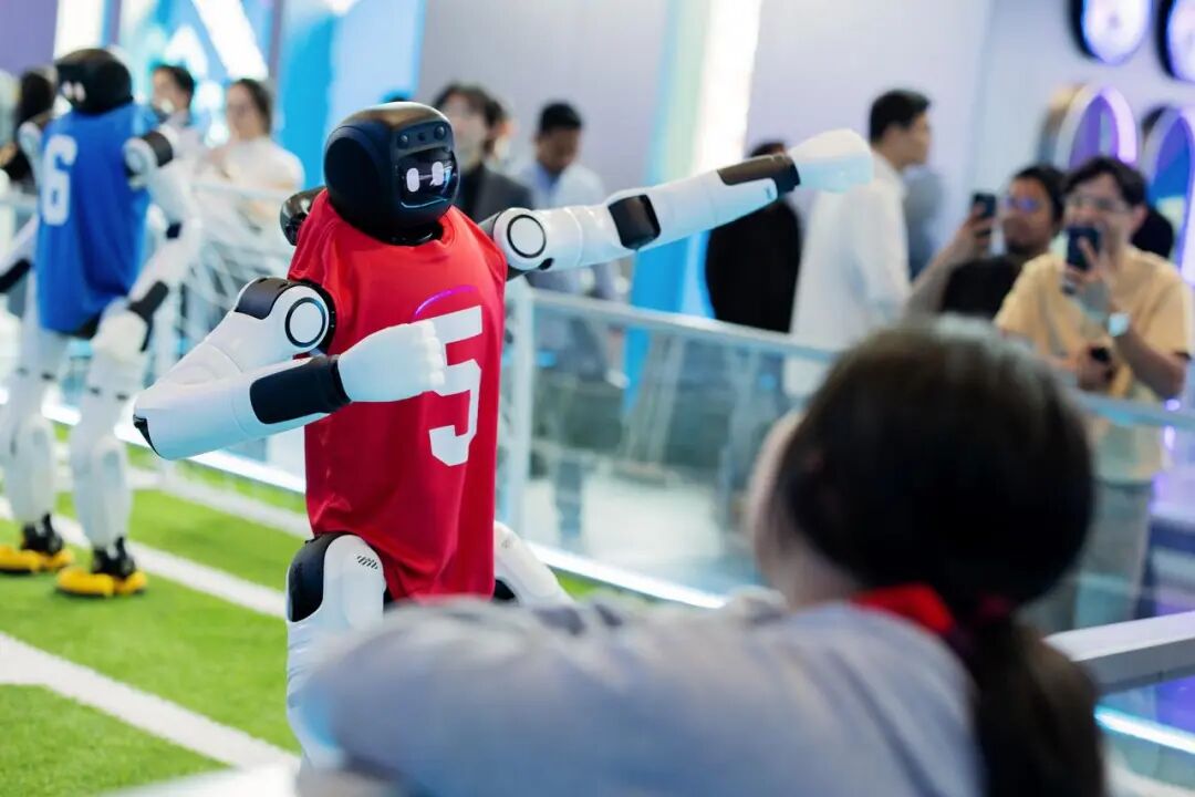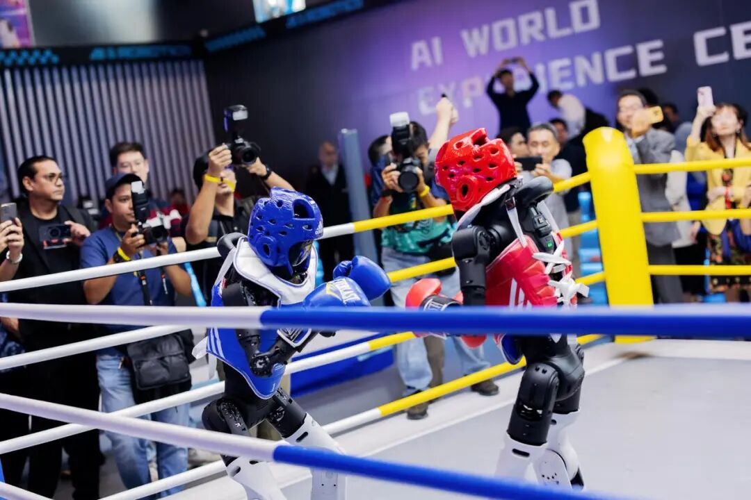 馆内,智元全系列机器人化身百变角色,打造赛博世界。入口处,酷拓D1的舞狮表演与灵犀X2奏响的24节令鼓相映成趣,传统文化与尖端科技融合,别有意趣。场馆内,远征A2变身场馆“服务官”,不仅能和来宾们拍照打卡互动,还能用英文、马来语迎宾导览,为在场的体验嘉宾递上各色饮品;酷拓D1系列越野跑酷,灵活走位赢得在场观众的阵阵掌声,多台酷拓D1还在擂台上演多场紧张刺激的“对战”,吸引观众目光;现场观众们还可体验一把机器人射箭,感受精灵G2遥操作的超低延时和超高精度。灵犀X2能文能武——“文”能科普教育;“武”能带来酣畅淋漓的拳击表演;跳舞、踢足球、打地鼠更是不在话下,逗得在场嘉宾眉开眼笑,深受现场小朋友们的喜爱,“下次还要来和机器人朋友玩”。