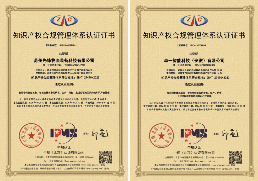 专家组依据国家标准,通过文件审阅、记录核查、现场询问及部门走访等多种方式,对卓一(苏州+安徽两地工厂)在智能物料搬运装备、智能仓储装备、智能机器人、工业机器人、工程机械设备的研发、生产、销售、上述过程相关采购的知识产权管理情况进行了深入、细致的审查。各部门负责人认真对接、如实反馈,展现了卓一在知识产权管理上的规范态度和扎实基础。