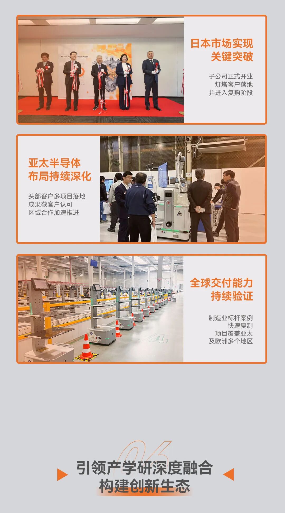 公司为合作伙伴提供移动机器人本体及相关集成解决方案。致力于为半导体及电子制造,飞机制造,汽车零配件等制造行业提供工厂自动化及场内物流解决方案。为电力电网、能源冶炼、商业物业及公共交通等行业,提供巡检及自动化维保解决方案。