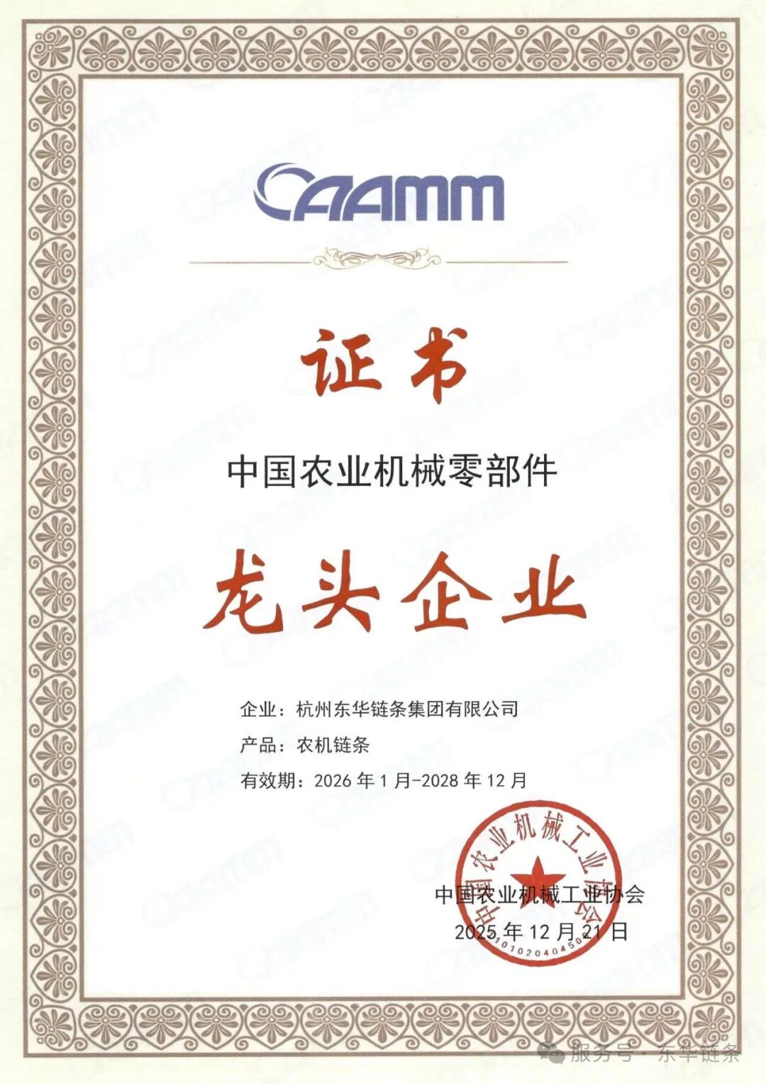 近日,在2025年全国农机工业工作会议暨中国农业机械工业协会七届二次理事会上,东华链条集团凭借在农机链传动领域的技术积淀、产品可靠性与市场服务等方面的综合实力,再次获评 “中国农业机械零部件龙头企业” 称号,有效期三年。