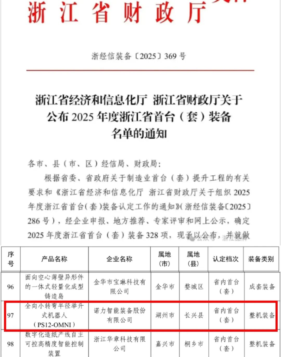 近日,浙江省经济和信息化厅、浙江省财政厅联合发布《2025年度浙江省首台(套)装备名单》,诺力智能装备股份有限公司自主研发的“全向小转弯半径举升式机器人(PS12-OMNI)”成功入选,标志着诺力在智能物流装备领域的创新能力与技术实力再获权威认可。