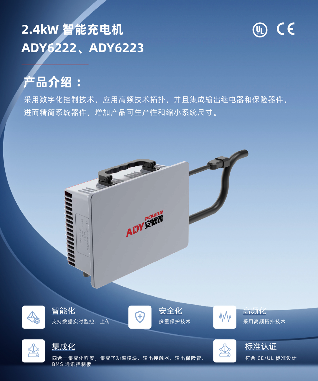 ADY622X采用四合一集成化设计,将功率模块、B+MS通讯控制板、输出继电器、输出保险管集成一体,精简系统器件、缩小产品尺寸;相较传统充电机减重56%,整机仅8.5kg。产品轻量化设计便于车载使用,适配户外辗转作业场景。