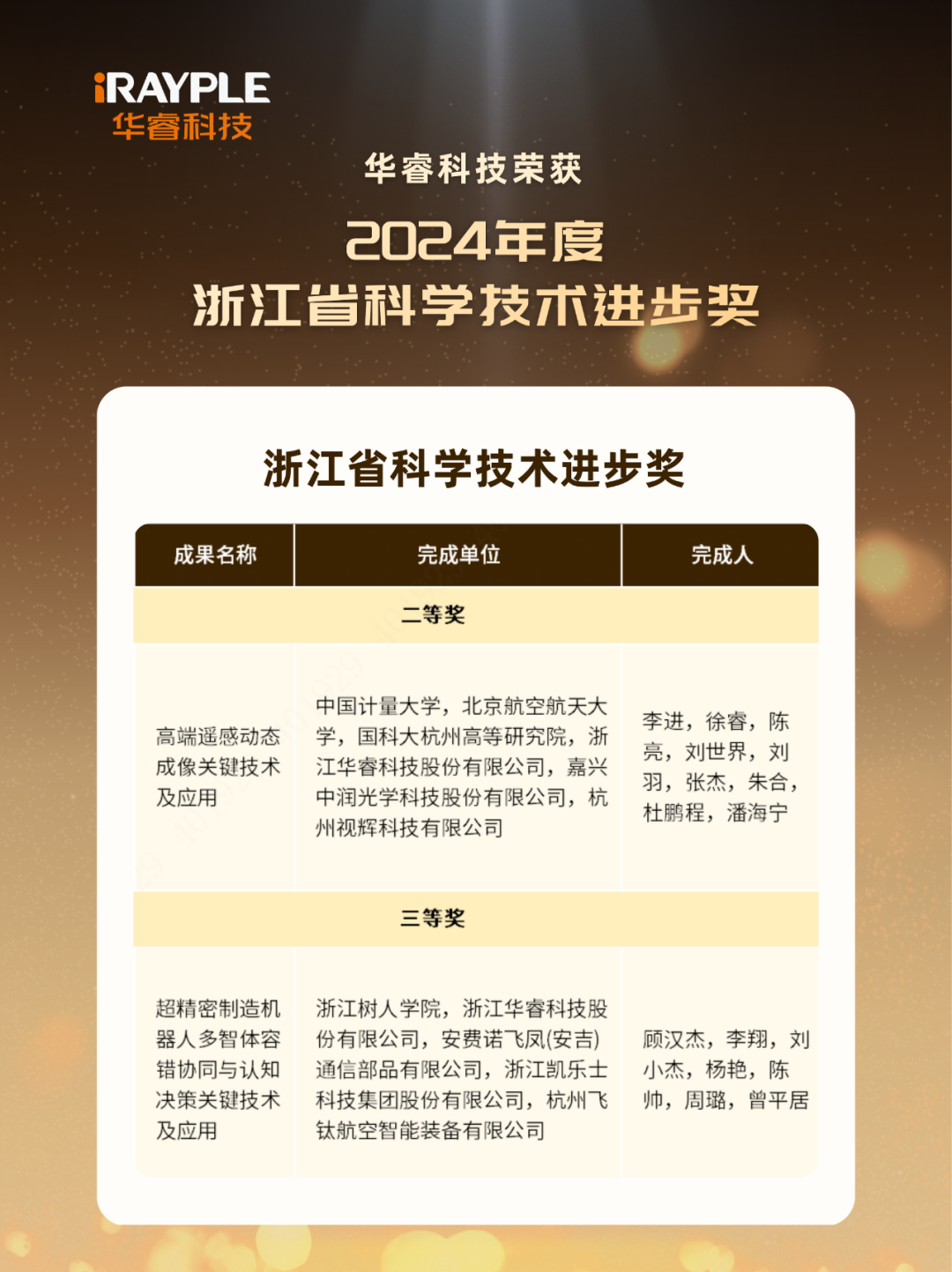 2月9日,全省建设一流创新生态打造最具竞争力营商环境大会在杭州举行,并对2024年度浙江省科学技术奖进行了集中表彰。华睿科技凭借在机器视觉与机器人领域的技术积累与协同创新,斩获2项荣誉,实现了新的突破。其中,联合完成项目《高端遥感动态成像关键技术及应用》荣获浙江省科学技术进步二等奖,《超精密制造机器人多智体容错协同与认知决策关键技术及应用》荣获三等奖。浙江省科学技术奖旨在表彰在科技创新与成果转化中作出突出贡献的单位及个人。此次获奖,正是华睿科技持续深耕先进技术与协同创新的有力印证。未来,我们将继续坚持核心技术攻关,以前沿突破推动理论创新与领域拓展,为浙江的创新发展战略注入关键动能。