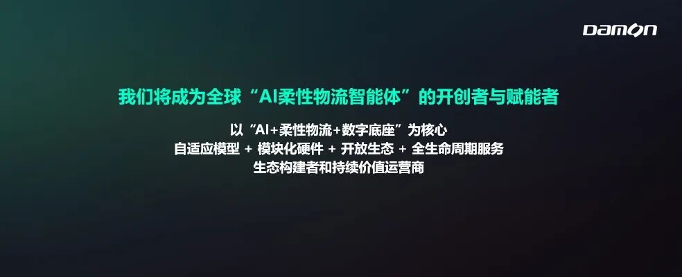 2026年,德马将正式开启全球AI智能体产业化新纪元,核心定位从智能物流设备和系统的提供者,全面升级为AI赋能的物流智能体创造者、端到端无人化物流整体解决方案的设计师和建造师,并立志成为全球“AI柔性物流智能体”的开创者与赋能者。德马将以“AI+柔性物流+数字底座”为核心,立足智慧物流行业,从核心部件、具身本体到数据模型、应用场景落地,构建“自适应模型+模块化硬件+开放生态+全生命周期服务”完整的具身AI生态体系,做物流行业具身AI的持续价值运营商。