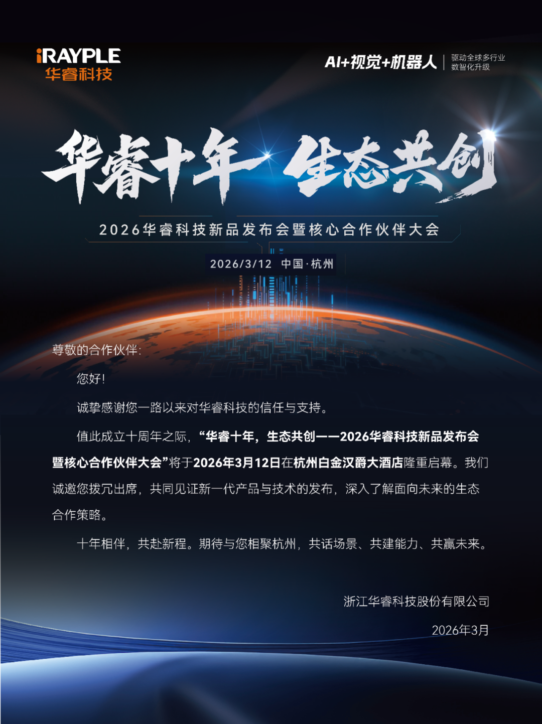 华睿十年,生态共创——2026华睿科技新品发布会暨核心合作伙伴大会将于2026年3月12日在杭州白金汉爵大酒店隆重举行。本次大会,既是十周年的重要节点,也是面向未来的战略发布与生态共建起点。我们诚邀您相聚杭州,共同见证华睿迈向全球产业智能领导者的新阶段。