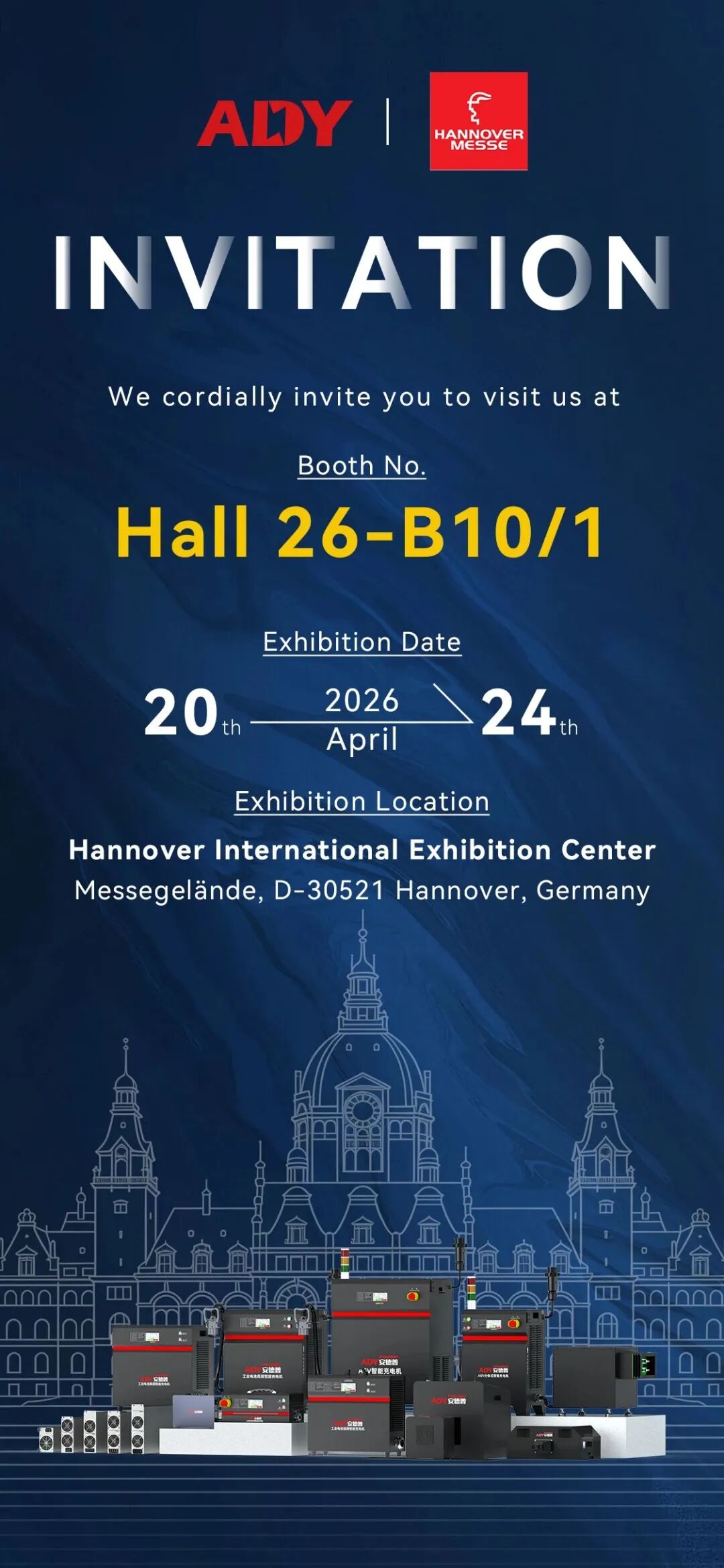 Hannover International Exhibition CenterADY Power will exhibit at Hannover Messe 2026, from April 20 to 24. A full range of EU-standard products, including ADY Power’s Smart Charging Module, Smart Charger, and Intelligent AGV Charger, will be showcased at the event. With its leading all-scenario product matrix, ADY Power will provide safer, more efficient, smarter, and more convenient smart charging solutions for the German and global markets.We sincerely invite you to visit Booth Hall 26-B10/1 to witness ADY Power’s cutting-edge technological achievements.
