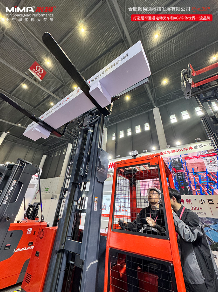MiMA米玛窄巷道叉车凭借其针对高位仓储拣选、长物料搬运与纵深空间高效利用的专业设计,吸引了众多参观者的关注。该产品能够显著应对土地资源紧张、仓储布局受限、人力成本提升及作业安全风险等行业共性挑战,以其创新设计和实用价值,收获了现场专业人士的广泛好评。