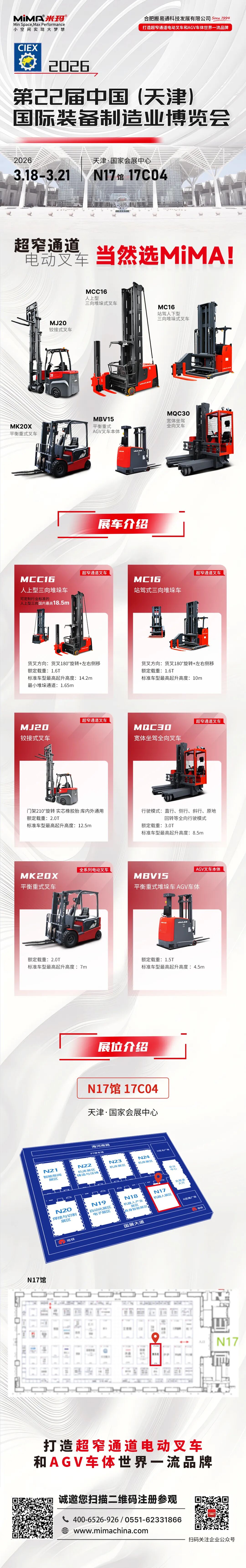 合肥搬易通(MiMA米玛)作为国内超窄通道电动叉车和AGV车体制造领域领军企业。在本次天津工博会将展示多款明星产品,包括MCC16人上型三向堆垛车、MC16站驾式三向堆垛车、MJ20铰接式叉车、MQC30宽体坐驾全向叉车、MK20X平衡重式叉车、MBV15平衡重式堆垛车AGV叉车,充分体现MiMA米玛在高位密集仓储、长重物料堆垛以及AGV车体应用等领域的优势。MiMA米玛不仅能够深刻洞察不同行业仓储痛点,为客户提供精准高效的定制化物料搬运解决方案,还能帮助企业快速实现仓储物流的转型升级。