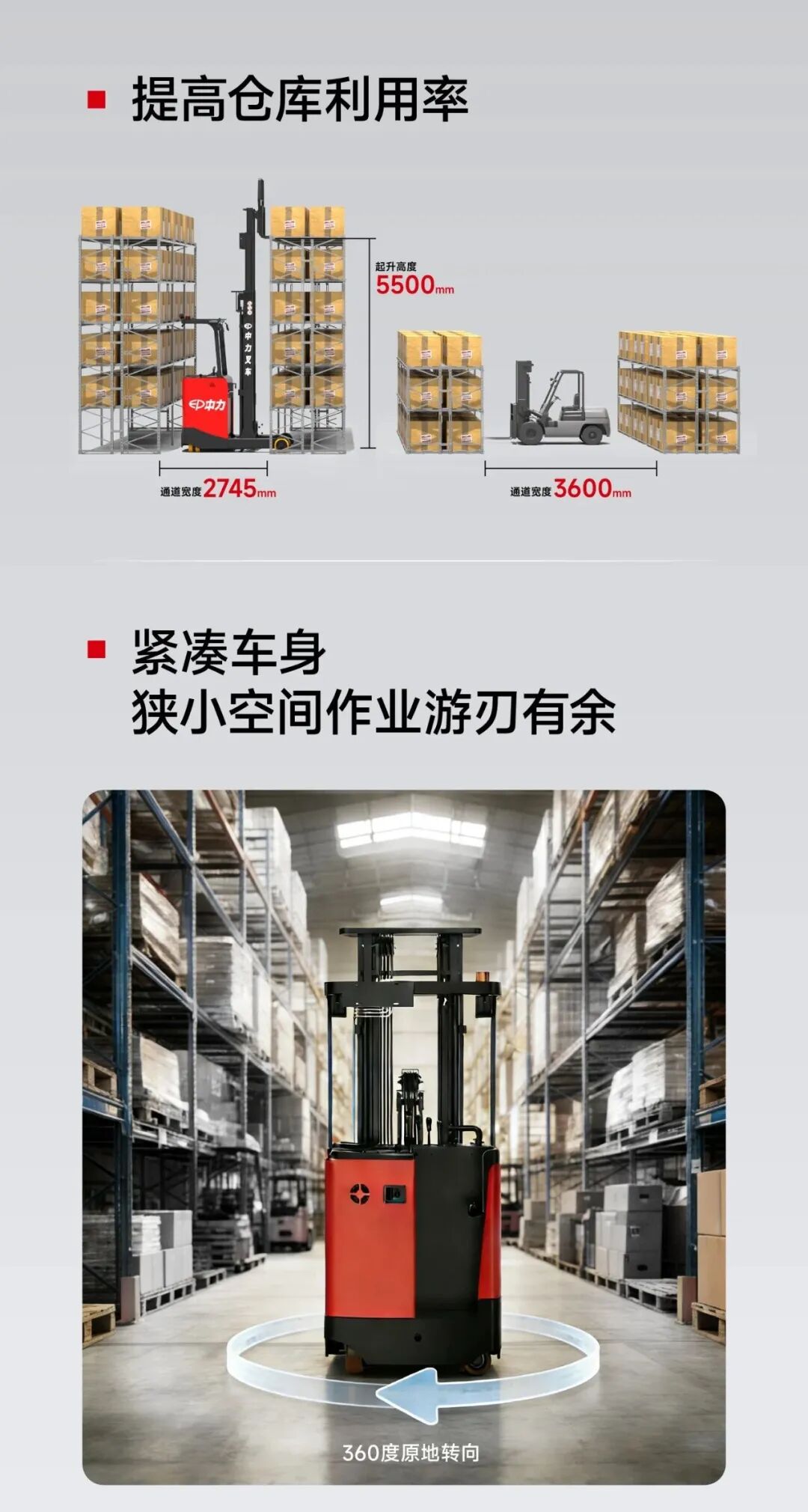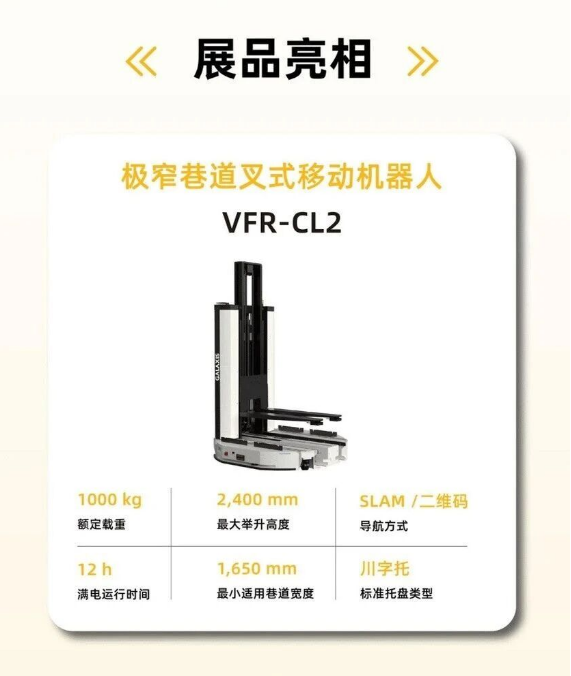 高空间适应性:前移式紧凑机身,直角堆垛通道宽度<3米,可直接适配原人工叉车通道。
