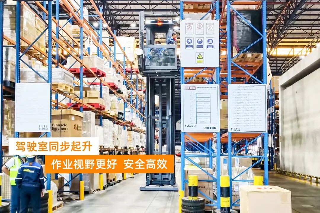 人上型三向叉车13.5m起升高度充分利用垂直空间,在行驶过程中驾驶舱及货叉可同步升降,能够大幅减少无效的等待时间,保障存取、拣选过程的连续性。