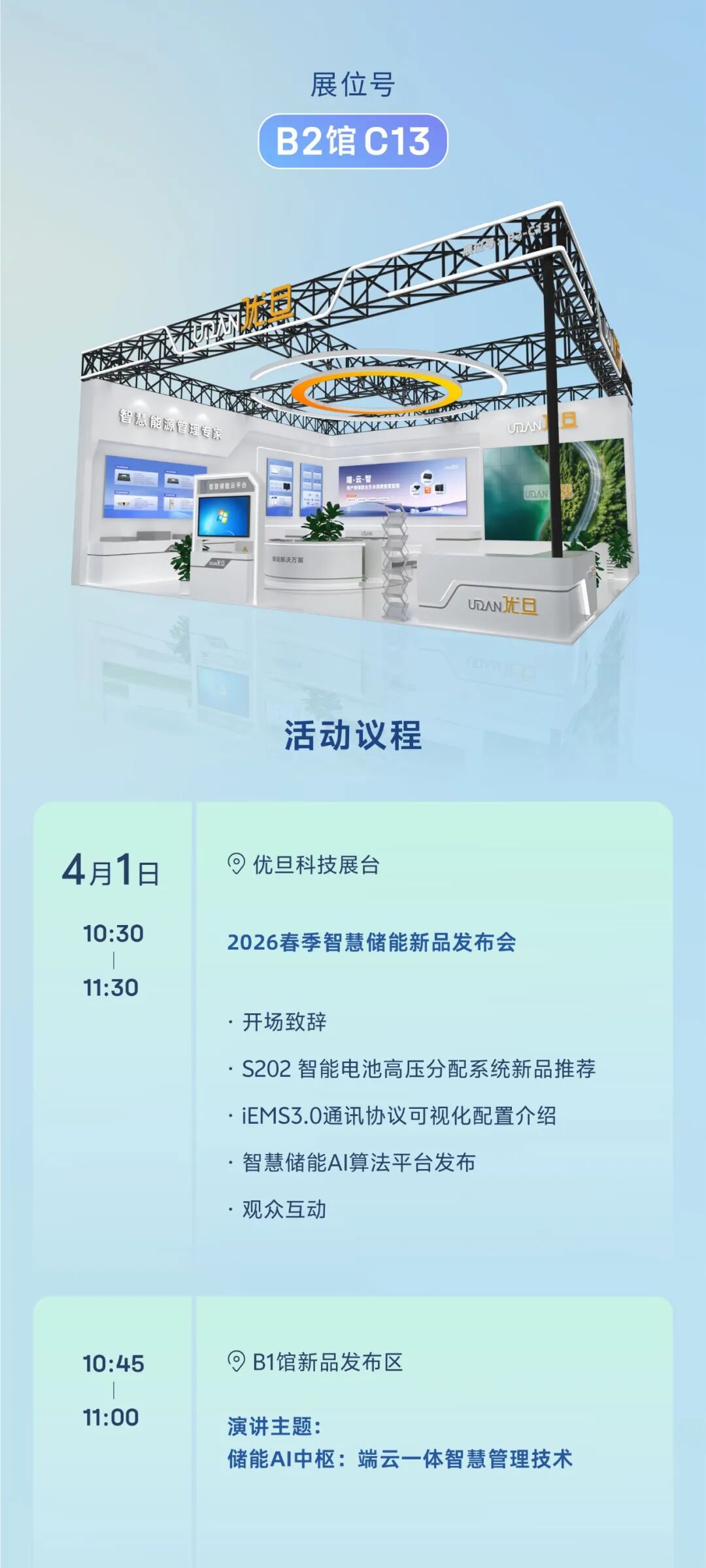 此外,现场还将展出iEMS、iB+MS、iPDU、汇流柜及智慧储能云平台全品类产品矩阵,打造用户侧储能全场景解决方案,全方位适配多元化应用需求。4月1日,北京首都国际会展中心B2馆C13,优旦科技邀您亲临,共探新品创新内核,见证智慧储能技术新突破!