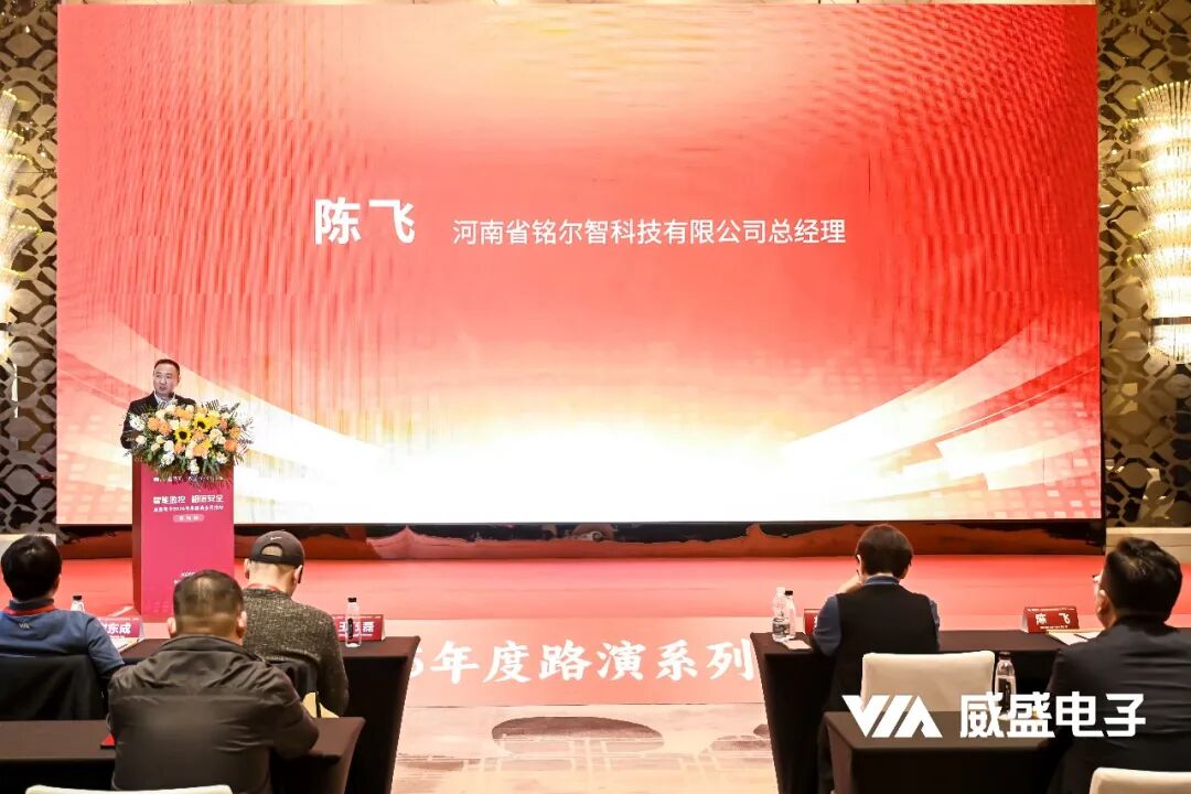 本地合作伙伴代表、河南省铭尔智科技有限公司总经理陈飞先生以“智驭安全,行稳致远——开启叉车作业‘零碰撞’新时代”为主题发表致辞。他高度评价威盛AI智能叉车防撞设备:“这是一套集成了人工智能、毫米波雷达、高清视觉识别于一体的主动安全防御系统。我给它的评价只有三个字:‘准、快、智’。”