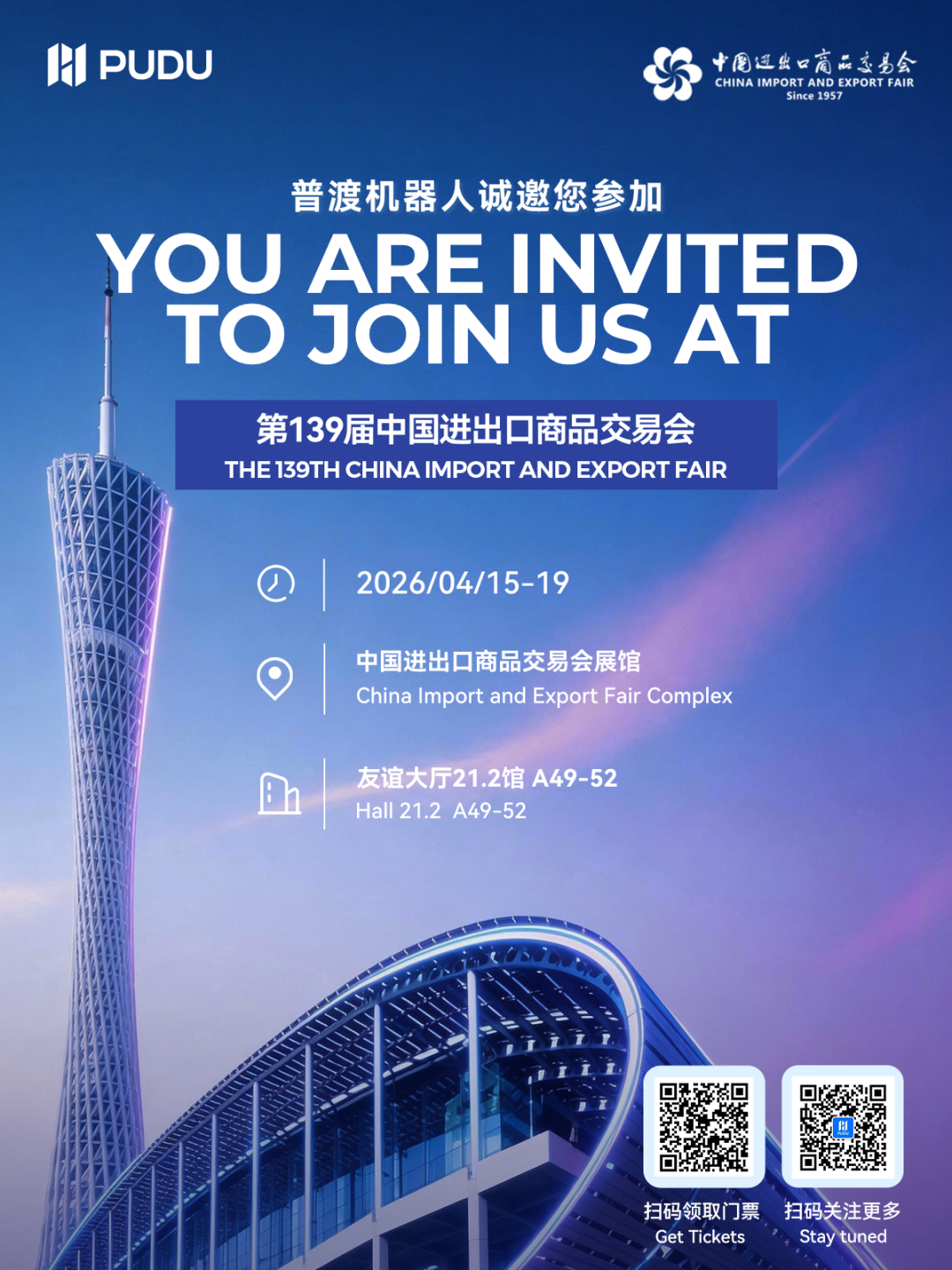 时间:2026年4月15-19日地点:广州·中国进出口商品交易会展馆展位:友谊大厅21.2馆 A49-52从配送到清洁,从工业到具身智能,普渡机器人以领先的商用服务机器人解决方案,服务全球80多个国家和地区。本届广交会,我们将展出最新服务机器人矩阵,现场体验高效、稳定、智能的自动化服务能力。