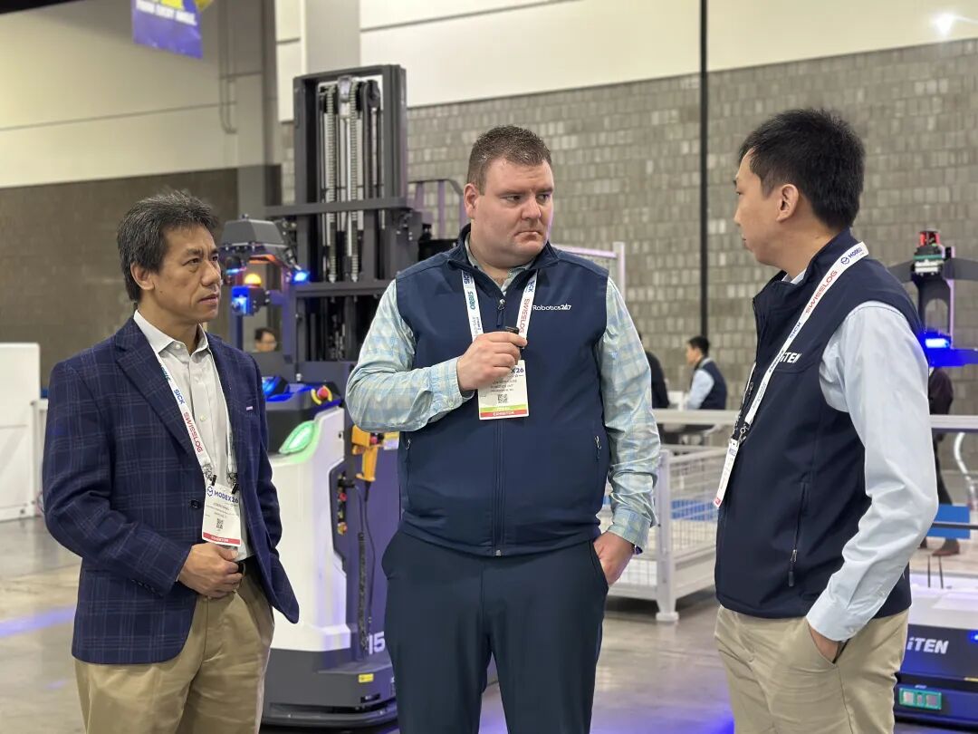 MODEX 2026展会期间,AiTEN展位获得全球行业伙伴的广泛关注。展会搭建阶段,MHI(美国物料搬运协会)副总裁Greg Baer先生莅临展位,双方围绕展会生态、MHI会员体系及未来市场合作方向深入交流,就后续潜在合作保持开放沟通,为AiTEN深耕北美市场奠定良好基础。