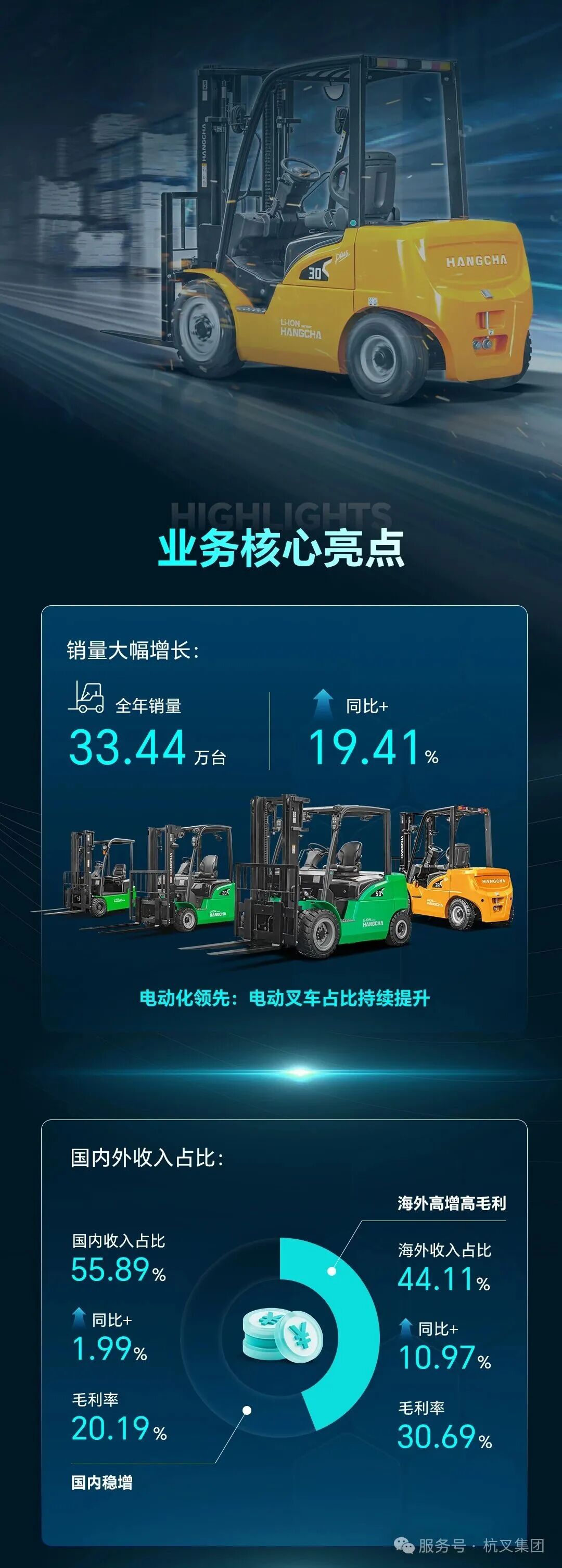 公司主导产品为叉车及其他物料搬运设备,已形成1-32吨内燃叉车、0.75-8.5吨蓄电池叉车、集装箱专用叉车、牵引车、搬运车、堆高车、越野叉车、伸缩臂叉车登高作业车等全系列、多品种的产品结构,产品已遍布全国,并远销130多个国家和地区。产品在国内的市场占有率达到近30 %,出口占到国内机动叉车出口量的1/3,是中国目前最大的叉车出口基地之一。 2012年集团营业收入92亿元。