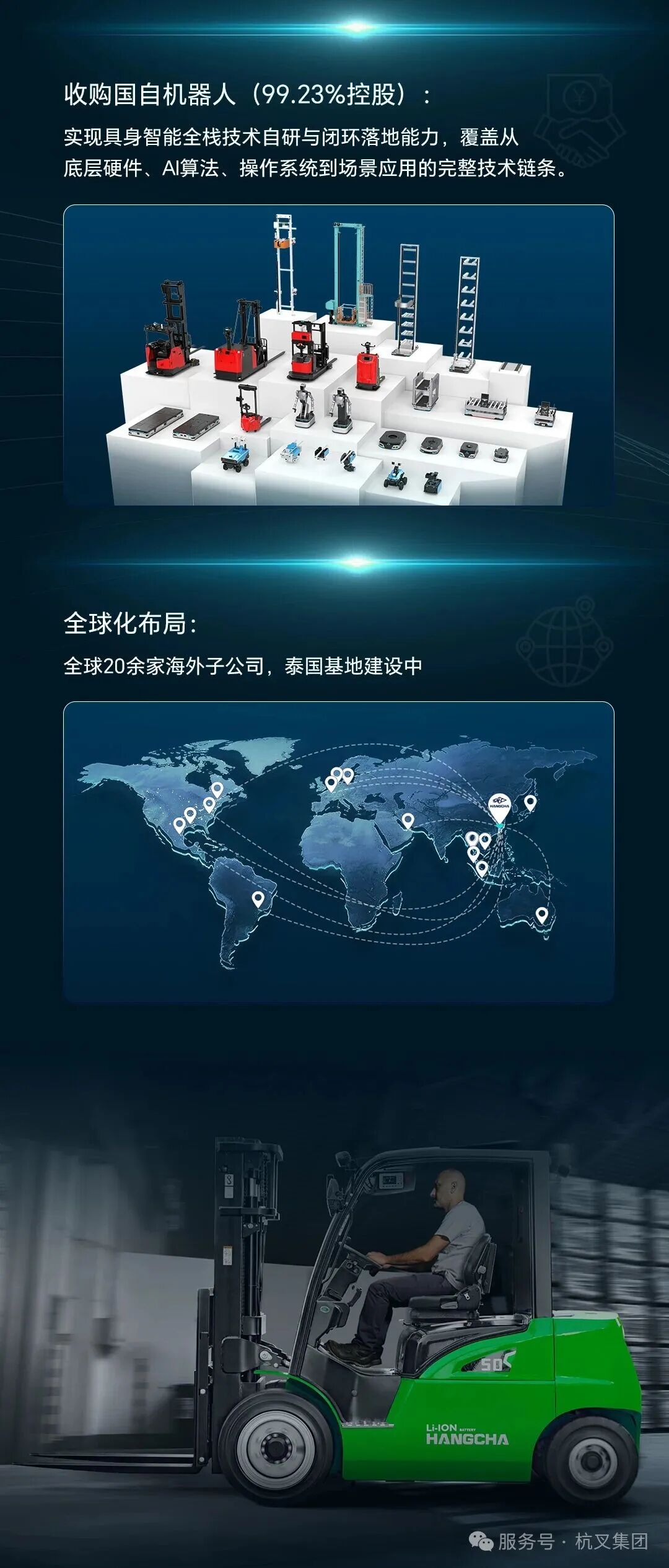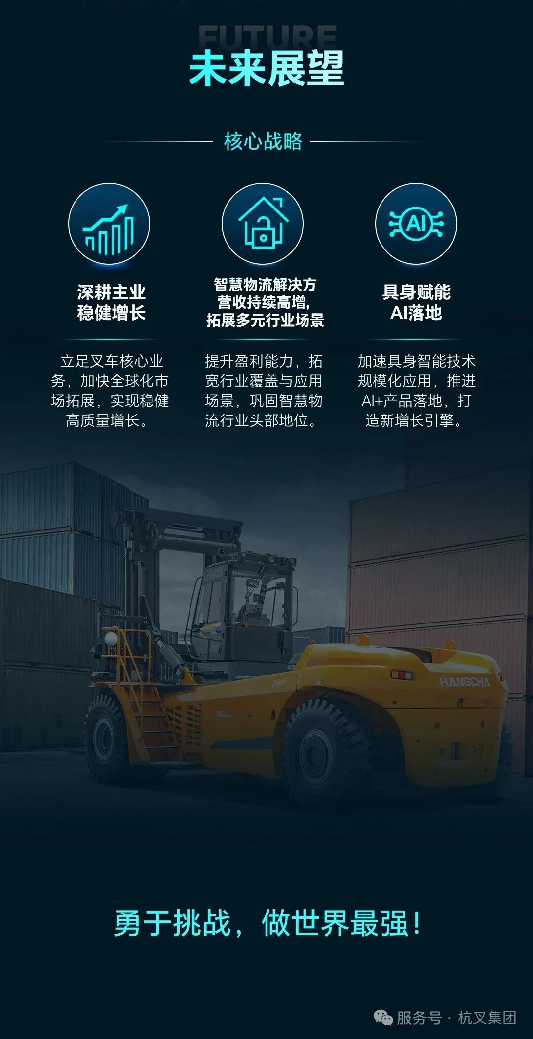 公司以“做世界最强的叉车企业”为愿景,专业于物料搬运,致力于品质进步,积极实施“专业化生产、品牌化经营、集团化运作、全球化整合”的公司战略,以“进取、务实、创新、和谐”的企业精神,创造价值,回报社会,为您提供最真诚的服务。