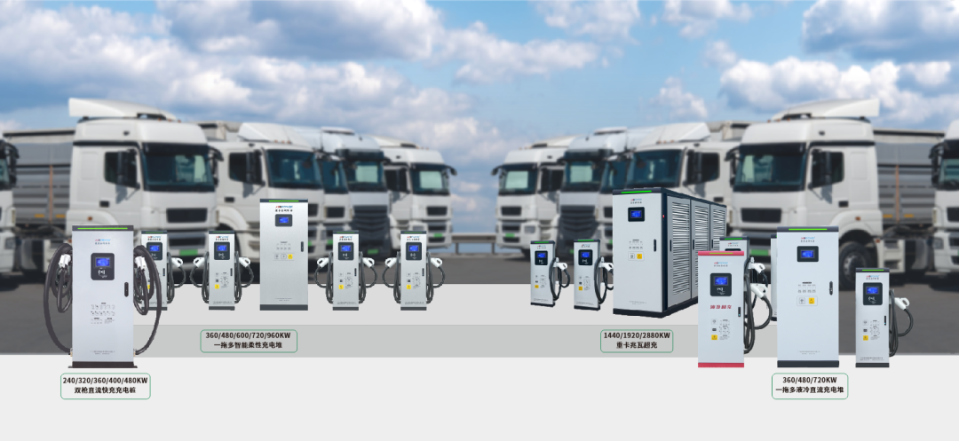 高功率输出:聚焦重卡大功率、快速补能要求,功率配置灵活可选,从240-2880kW,单枪输出250-400A,液冷终端可达600-800A,满足各类场站需求;电压覆盖200-1000V,全面适配主流电动重卡。