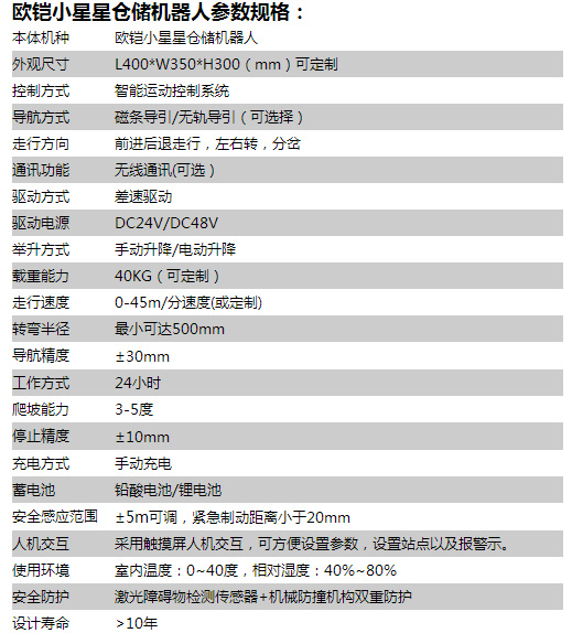 深圳市欧铠智能机器人股份有限公司推出一款迷你小巧的“小星星”仓储机器人,专门针对工厂内简单轻型的物料搬运。该产品规格仅为400mmx350mmx300mm,总载重可达到40公斤,是目前市场上最小型的AGV产品之一。