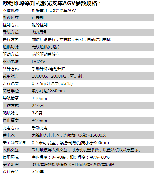 欧铠堆垛举升式激光叉车AGV技术成熟,有性能稳定、运行可靠、性价比高等诸多优势。堆垛举升式激光叉车AGV是欧铠根据企业自动化物流需求开发的一款激光导航AGV产品,负载能力大,在没有人操作的状态下,即可自动叉取/卸载物料,能轻松完成装货、运输、卸货等一系列“重体力活”,广泛应用于托盘等物料输送场合。