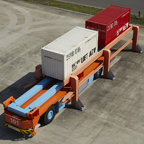 升降式AGV是已成熟的Terex® Gottwald AGV技术进一步发展的产物。与传统AGV不同,升降式AGV具有两个主动升降平台,使运输车可在堆垛起重机前方互通区内的转移货架上独立起吊并放置集装箱。升降式AGV可装卸任意尺寸的一个集装箱,也可相互独立地装卸两个20’集装箱。