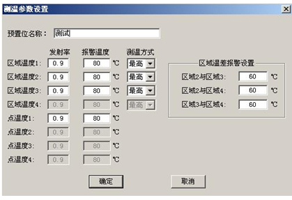 如图4-6所示,可通过点、温控件的绘制,设置任意图像区域内的报警温度,当软件检测到图像内红外温度超过报警温度值时,系统报警提示并记录日志。
