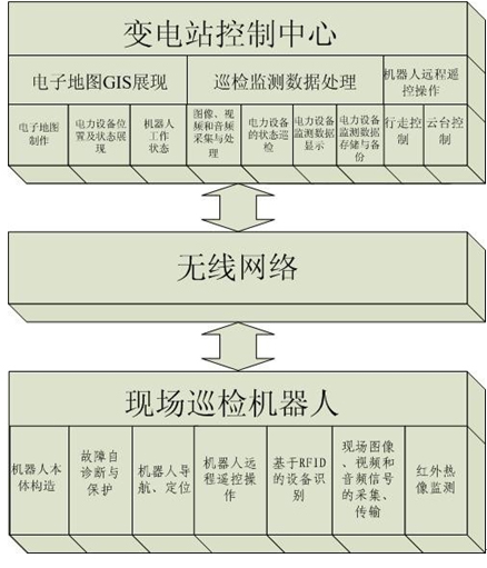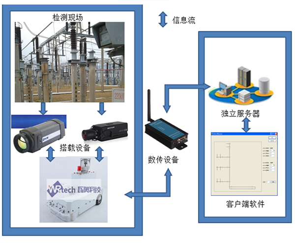 电力巡检机器人应用于室外变电站环境中,能够负载指定设备(包括:红外热像仪、紫外热像仪及摄像机中的一种或几种),在变电站内,通过采用视觉识别技术,定时自动从固定地点出发,按照设定的路线行走,在各个监控点采集监控信息反馈至客户端软件,并对机器人自身状态进行实时监测并反馈。