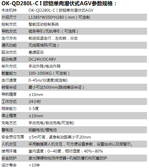 OK-QD280L-C I 欧铠超短型单向潜伏AGV,车身长1385mm,宽350mm,车体高度280mm,可以方便潜入牵引各种料车,承载量大,方便操作维护,行驶稳定,适用于物料供应量大的柔性生产线。