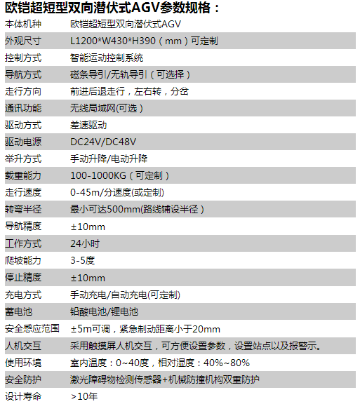 OK-QS180L2-C II 欧铠超短型双向潜伏式AGV车身只有1.2米,不用掉头就可以实现前进、后退,也可以实现原地旋转功能,AGV潜入到料车底部利用电动升降实现自动举升,把货物送达指定站点后,可自动反向倒退离开,占地空间小,能够极大程度上的节省人力。