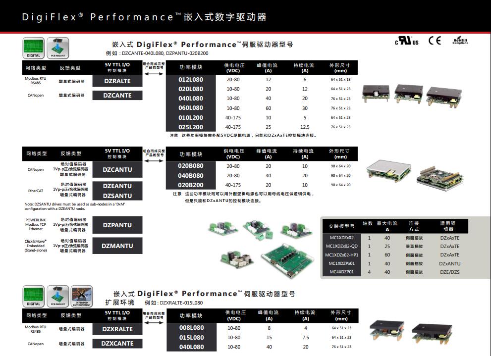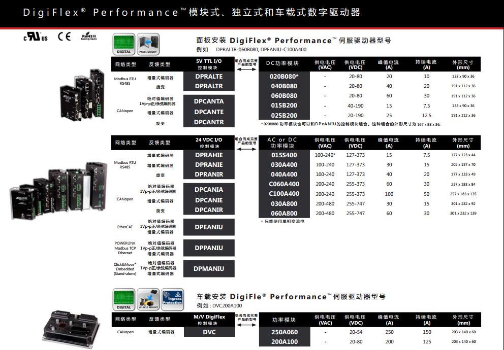 DigiFlex® Performance™系列高性能数字伺服驱动器品种众多,能够满足广泛的伺服应用需要。 DigiFlex®