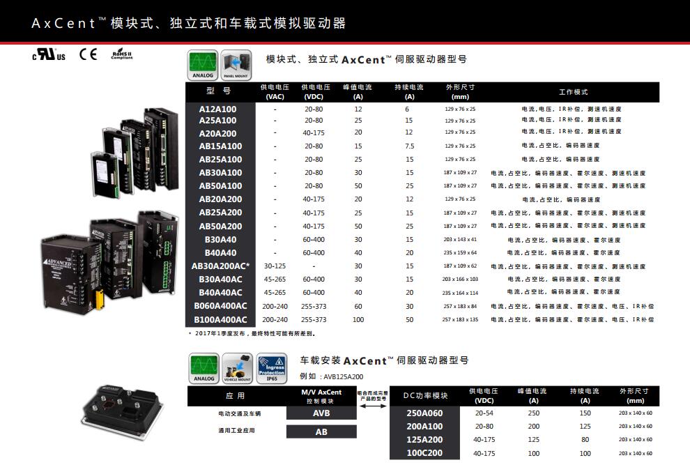 AMC有高性能的模拟量伺服驱动器,使用和安装比数字驱动器更为简捷,同时又能以更低的成本提供更高的带宽和响应时间。 AMC有丰富的伺服应用经验,帮助客户解决各种使用需求,产品支持+/-10V模拟量、 PWM加方向、双正弦波、及专门的电动车辆的控制信号。