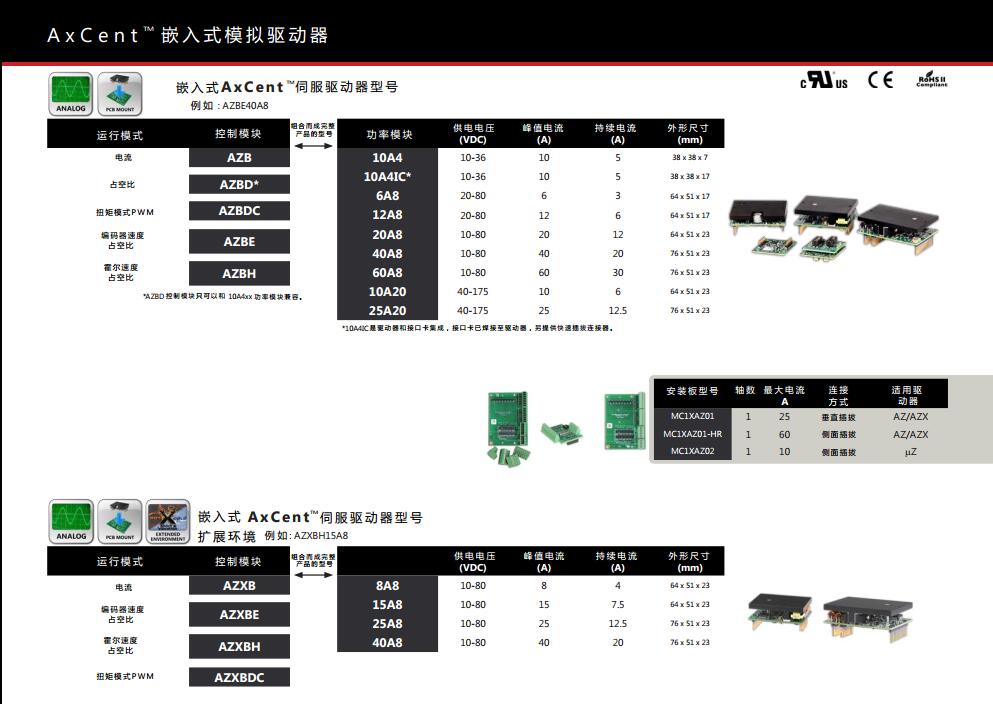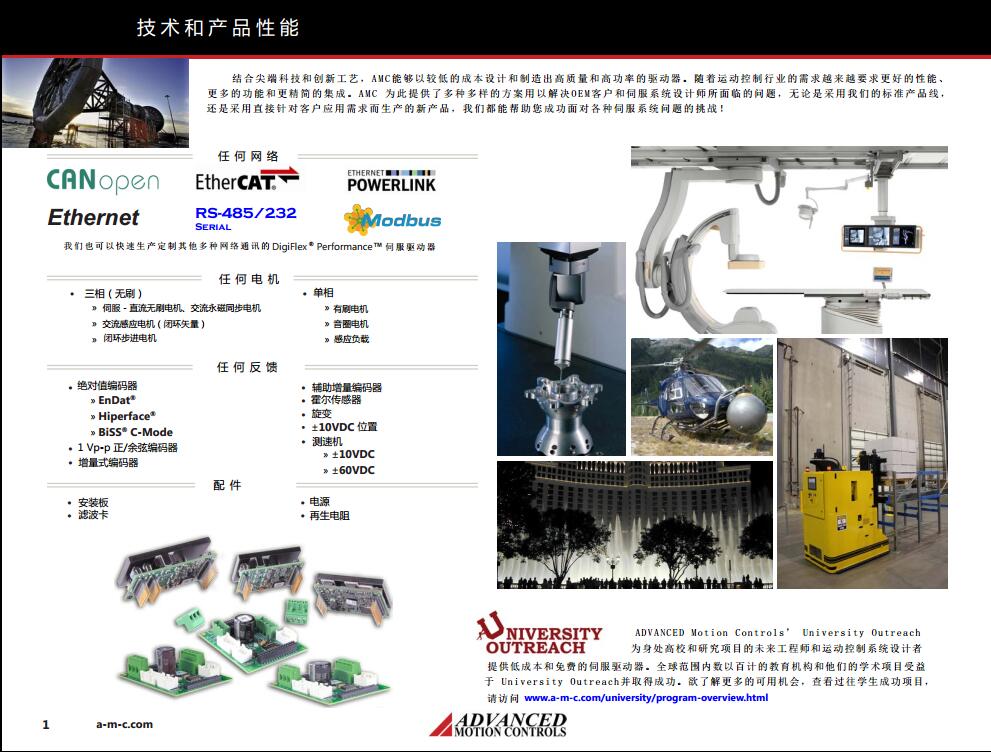 AMC致力于开发生产通用型的驱动器,现有的产品可以驱动有刷无刷电机,交流直流电机,直线电机,音圈电机,正弦信号电机。另外还有能嵌入式的产品,可帮助用户有效的节省设备空间。