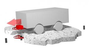 其主要工作原理基于电磁感应原理和无线射频技术。首先在地标磁钉(即一永久磁铁)中写入地址信息,定位地标内部的线圈接收地标天线发射的无线信号,一方面通过电磁耦合产生电流,地标被激活,于是就能为地标磁钉提供能量,另一方面根据接收的信号反馈相应的频率信息。