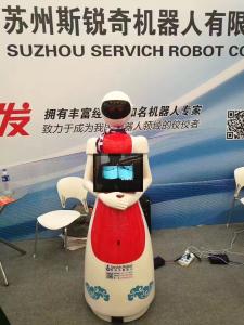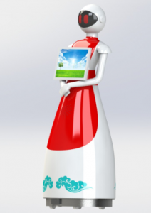 功能介绍:该迎宾机器人集成有触摸显示屏和专用软件,不仅可以通过视频和图片等形式播放用户产品信息,还可为顾客提供指路、引导、信息查询等服务。同时,该机器人还集成有语音交互功能,可以与顾客进行语音对话,包括:回答问题、数学计算、讲笑话、唱歌等。机器人可以实现无轨自主行走,不需要铺设磁条等,可以广泛应用在迎宾、导购、产品推广等场合。
