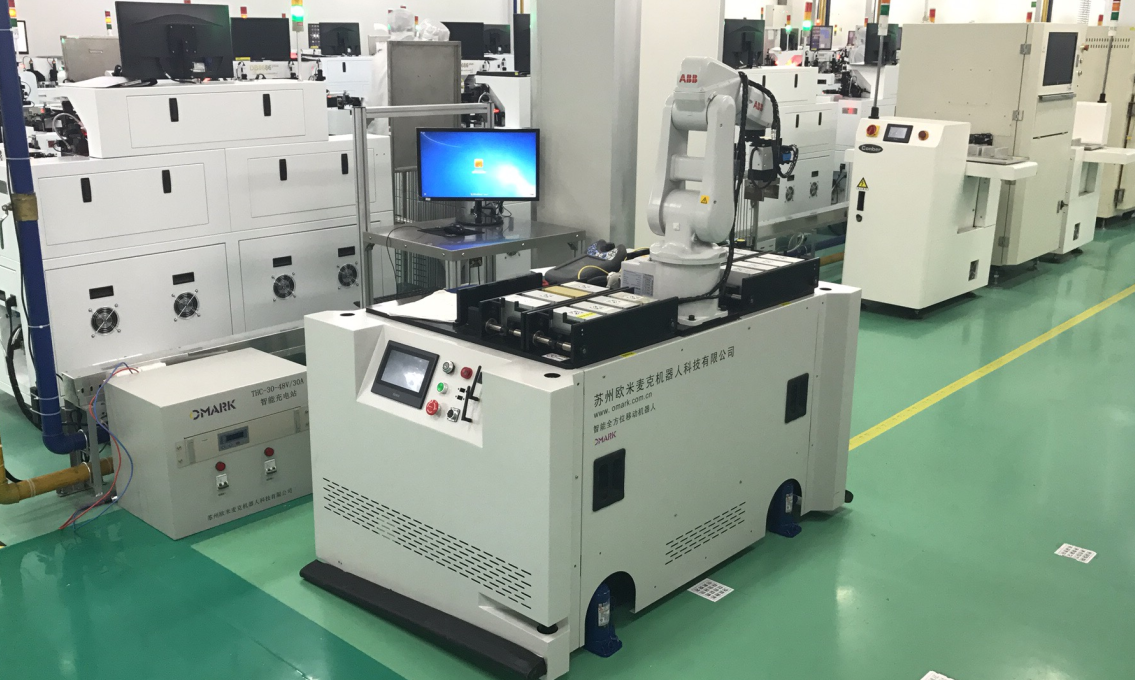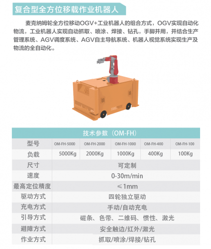 由苏州欧米麦克机器人科技有限公司自主研发的全方位移动物流机器人,采用了麦克纳姆轮全方位移动OGV+工业机器人的组合方式,OGV可以实现直行、横移、斜行、原地旋转等平面内360°任意方向的毫米级移动和精确定位,在狭小空间内穿梭自如,同时又具有毫米级的定位精度;工业机器人实现自动抓取、上下料,手脚并用。结合生产管理系统、AGV调度系统、AGV自主导航系统、机器人抓取系统实现生产物流的全自动化,提高物料配送效率和准确率,降低人工成本。