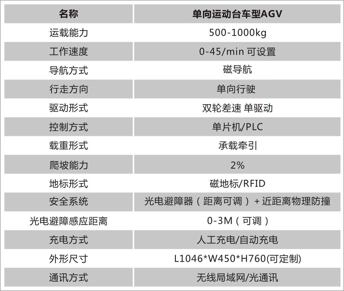 单向运动台车型AGV,可以直接运载或牵引料车,简单易用,配备无线调控系统,实现AGV状态设置与路径选择。