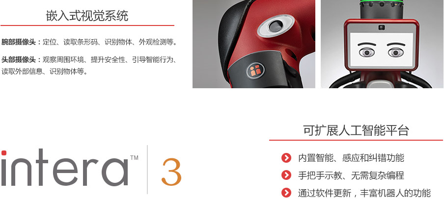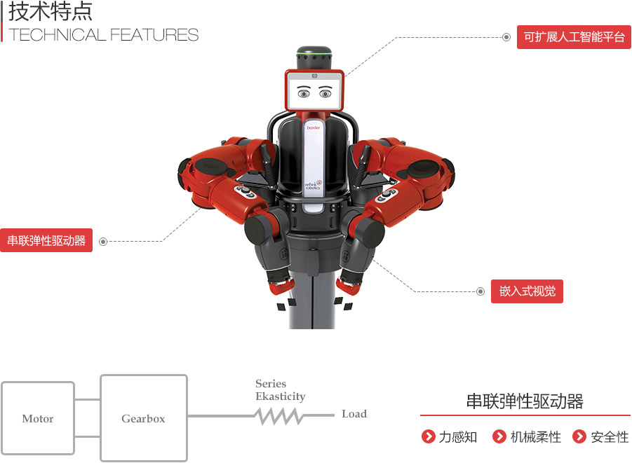 Rethink Robotics协作机器人安装和编程较为快捷,可通过先进的顺应控制运动系统(传感系统)、嵌入式视觉系统以及压力感应系统迅速地融入到现有工作环境中,并可根据实际需求迅速对工作进行调整;通过自主研发的可扩展软件平台及人机交互界面,Rethink Robotics可以像人类一样以更安全、更精准、更灵活的方式工作。