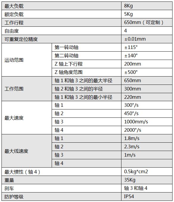 高速高精度大负载的水平四自由度机器人;速度快、负载大、精度佳、工作范围大、可靠性好、效率高;四个自由度和长臂展提供大工作包络面;圆润外形和波纹管能更好的防止灰尘和液体;给所有工业环境中的各种装配拾取应用提供最佳的加工质量并提高生产率。