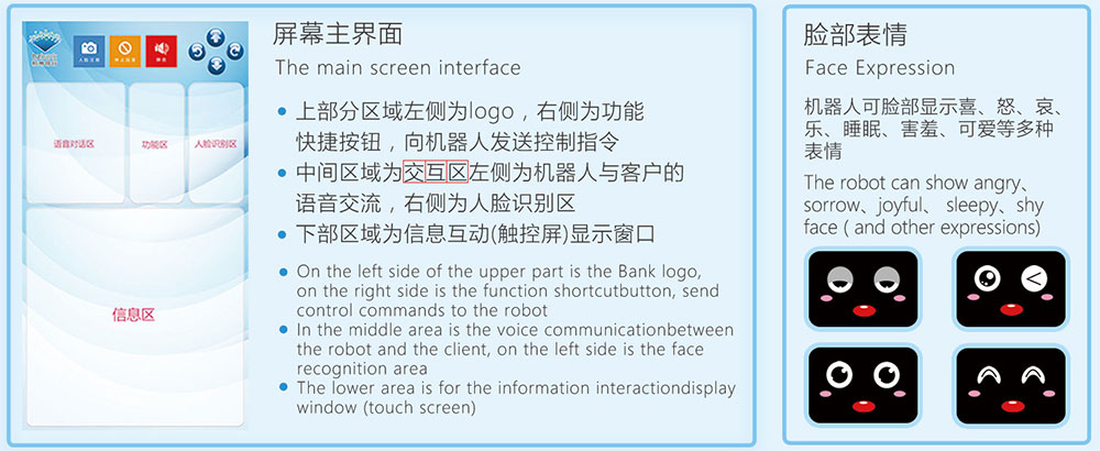 银行机器人的功能有:自定义脸部表情、屏幕调节升降、人脸辨识