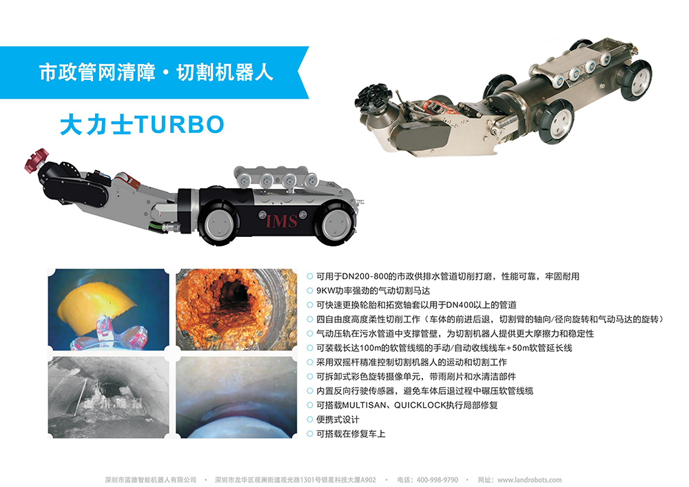 非开挖修复处理方案“管道切割机器人”,www.landrobots.com 蓝德智能机器人向市面共推出3款管道切割机器人,型号分别为:LD-80Q、LD-150Q、LD-200Q、分为针对管径为:DN80-250/DN150-600/DN200-800的市政排水管道,可进行管道堵塞切除、密封性能测试、CCTV视频检测等功能。