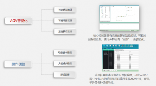 该方案以磁引导控制器为核心,包括高精度磁导航传感器、RFID及呼叫系统等。控制器自带地图和编程器,可真正实现AGV的智能化,搭载本控制器的AGV可实现自动寻迹、逻辑脚本编程等功能,可兼容市面上大多数的AGV类型,具有强大的兼容性和高度扩展性。在复杂路线和需高精度定位的应用场景,本方案具有绝对优势。