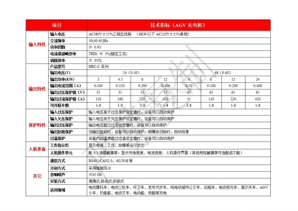 • AGV导航运输车在线充电系统,产品广泛应用于电力、铁路、通信、物流自动化、国防、石化、冶金、煤矿等领域的充电系统,并且可以完全替代进口产品。 产品特别适用电动摩托车、电动三轮车、环卫车、老年代步车、纯电动城市公交车、出租车、电动观光车、高尔夫车、AGV小车、钓鱼船、电动叉车、电动船、快艇等交通工具等。