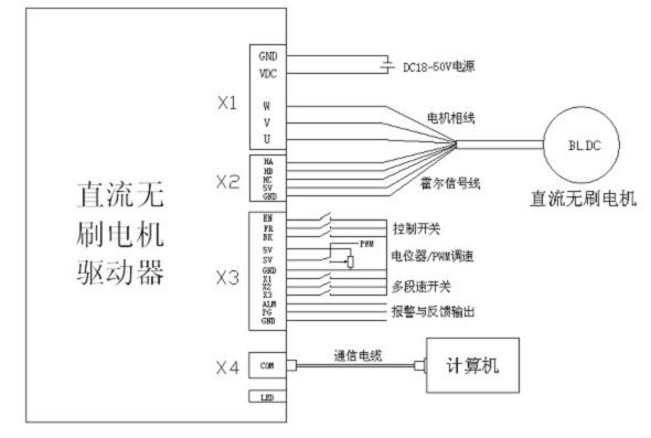 本公司研发生产的 BLDC 驱动器是一款高性能,多功能,低成本的带霍尔传感器直流无刷驱动器。 全数字式设计使其拥有灵活多样的输入控制方式,极高的调速比,低噪声,完善的软硬件保护功 能,驱动器可通过串口通信接口与计算机相连,实现 PID 参数调整,保护参数,电机参数,加减 速时间 等参数的设置,还可进行 IO 输入状态,模拟量输入,告警状态及母线电压的监视。
