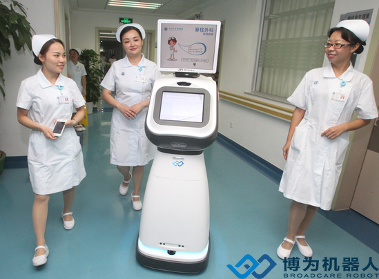 如何补充这一短板?北大深圳医院的做法是用智能引导机器人辅助护士。博为研发的护士助手机器人入住北大医院,能够在护士的指导下进行工作,主要功能是够帮助护士做一些机械性的重复工作,比如出入院护理、出入院宣教、健康宣教等。