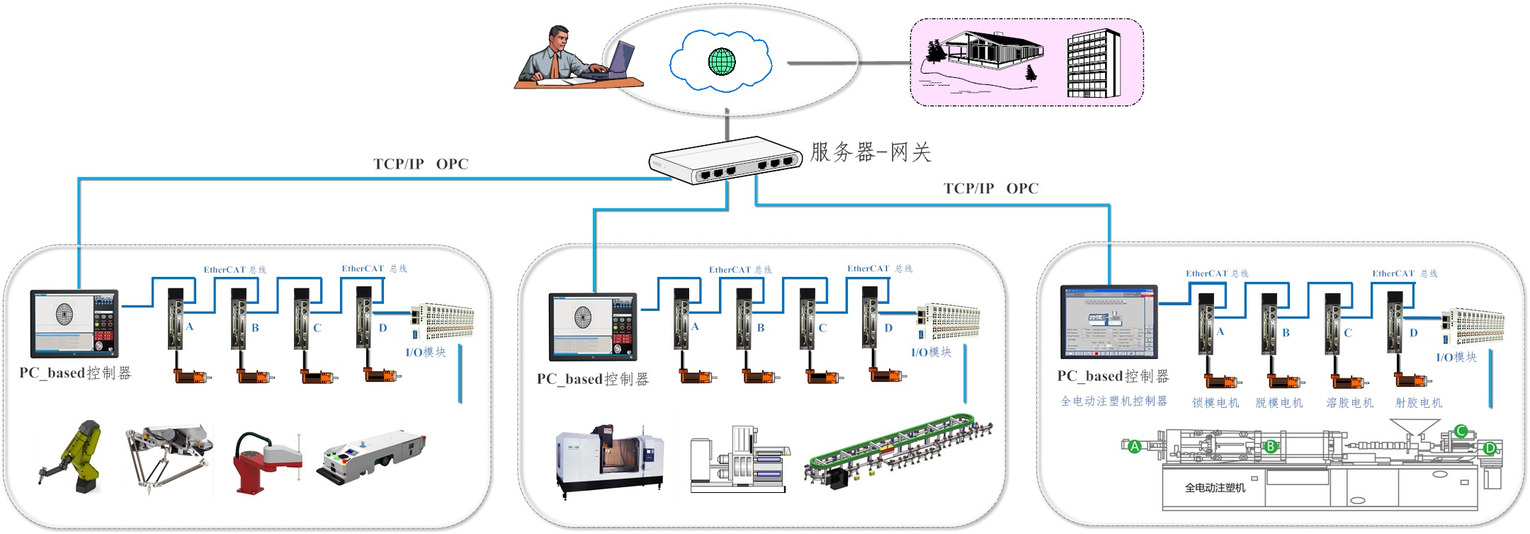 PC-based 控制器LW_MC_x86 采用Intel® Celeron®处理器的高性能PC、最高可配备Intel® Core™ i7处理器、Windows操作系统和CoDeSys RTE,提供了一个用于实现PLC、运动控制和CNC功能的高性能控制系统(如机器人控制系统、机床CNC系统、注塑机控制系统、自动化生产线等)。通过工业以太网EtherCAT总线链接工业现场执行机构(如伺服驱动器、调节器)和传感器,通过以太网(TCP/IP, OPC Server)接入工厂网络,可实现基于云平台的远程监控。